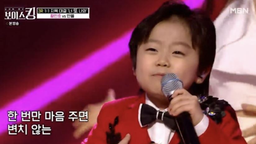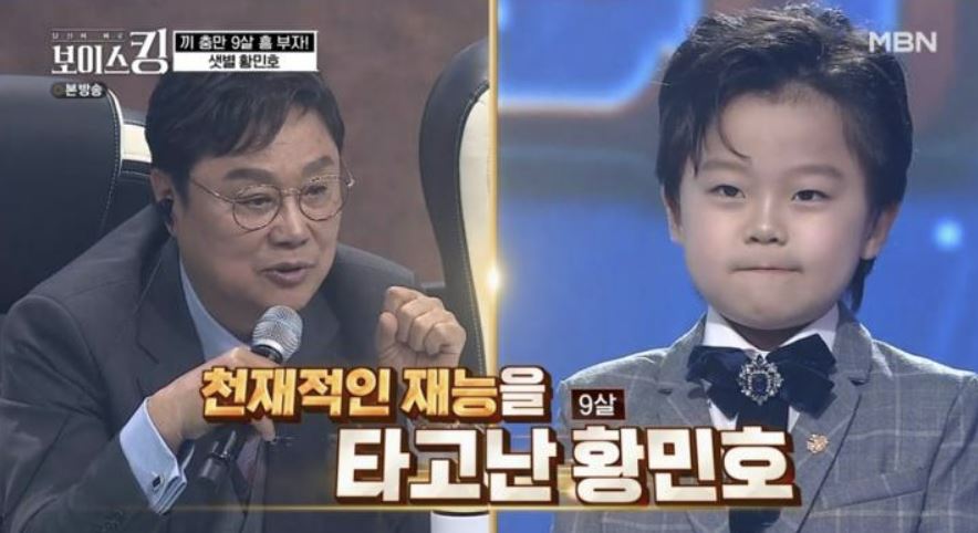 황민호 군은 바로 작년에 방영했던 보컬 서바이벌 프로그램 보이스킹에서 대중의 시선을 사로 잡았던 소년입니다. 2021년이면 고작 9살의 어린아이인데도 불구하고, 조금의 떨림이나 긴장감조차 느껴지지 않는 면모를 보여 사람들을 놀라게 했었습니다.